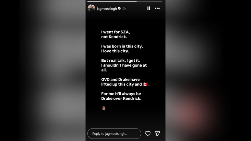 “I was born in this city. I love this city. But real talk, I get it. I shouldn’t have gone at all,” Singh wrote. “OVO and Drake have lifted this city and [Canada]. For me, it’ll always be Drake over Kendrick.”