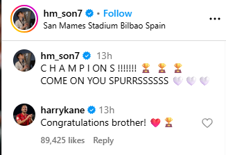 Kane commented on Son’s celebratory Instagram post with the message: “Congratulations brother,” accompanied by a heart and trophy emoji.